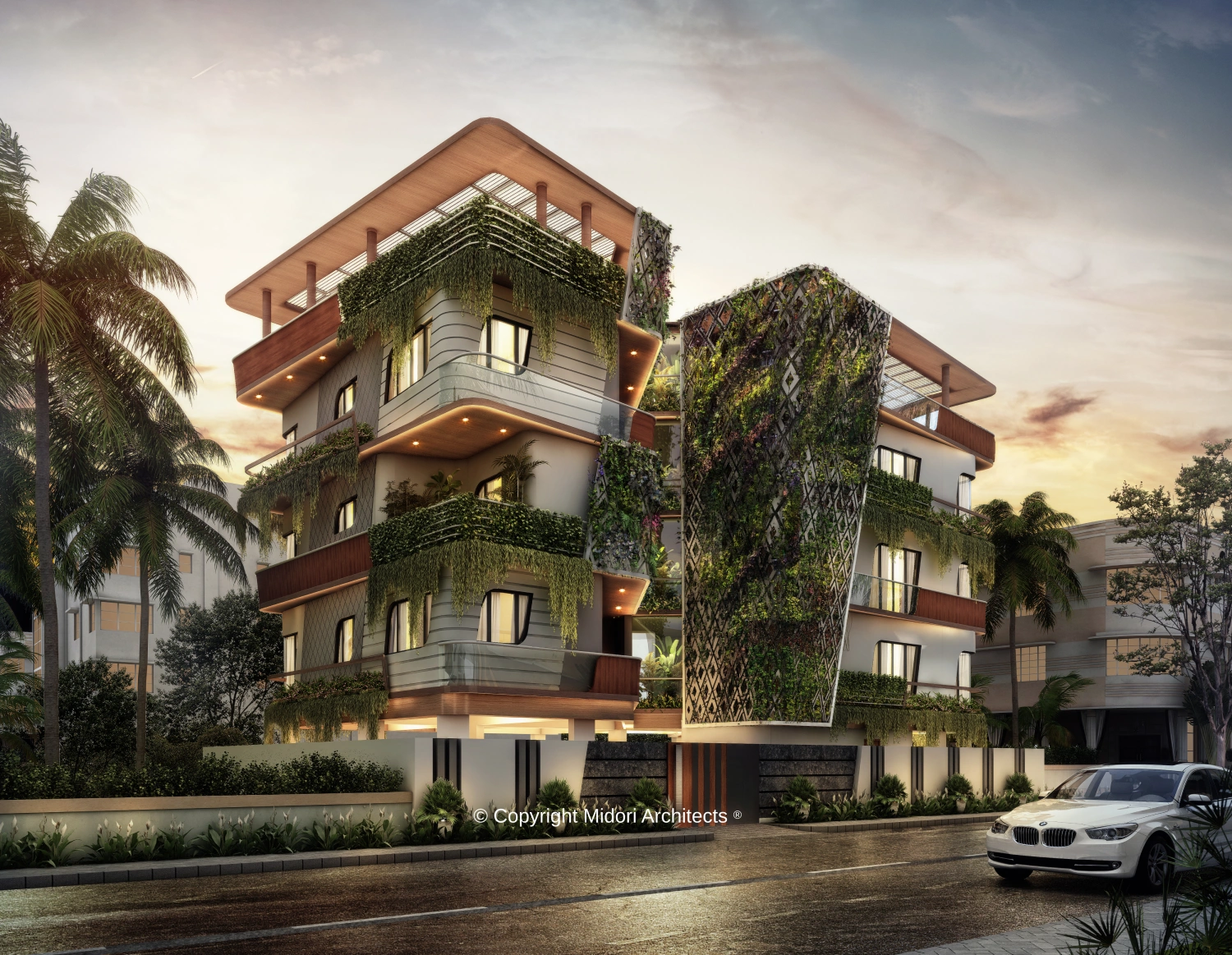The landscape features drought-tolerant vegetation like spider lily, lantana, jasminum polyanthum, vernonia creeper, and adenium. The vertical green wall panels (shading the balconies) use 100 percent recycled hydrophilic felt. Indoor plants are grown in a soilless mix of perlite, cocopeat, and vermicompost (2:1:1 ratio) at 27 plants/sq.m.